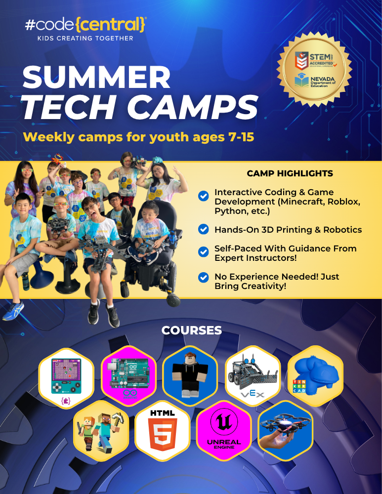Code Central's top-rated Summer Tech Camps cater to students (ages 7-15) of all skill levels, fostering STEM exploration through cutting-edge technologies. Dive into game & web development, mechanical engineering, and graphic design, enhancing critical thinking and problem-solving in a supportive environment. Campers also enjoy unplugged break times aimed to promote social and communication skills. Ideal for tech enthusiasts seeking a dynamic and educational summer experience!